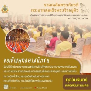 ขอเชิญพุทธศาสนิกชนร่วมพิธีเจริญพระพุทธมนต์และเจริญจิตตภาวนาถวายพระพรชัยมงคล และถวายพระราชกุศลพระบาทสมสมเด็จพระเจ้าอยู่หัว เนื่องในโอกาสพระราชพิธีมหามงคลเฉลิมพระชนมพรรษา ๖ รอบ ๒๘ กรกฎาคม ๒๕๖๗