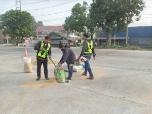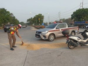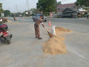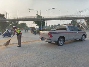 เจ้าหน้าที่ตำรวจจราจร สภ.บางปลาม้า ได้ร่วมกันเก็บกวาดเศษแกลบที่ตกหล่นบนพื้นถนน 340 บางบัวทอง-สุพรรณบุรี