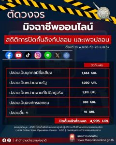 ทั้งนี้ตั้งแต่ 18 พฤศจิกายน 2566 ถึง 28 เมษายน 2567 ปิดกั้นลิงก์ปลอมไปแล้วทั้งหมด 4,995 URL