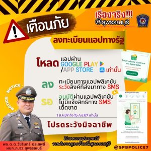 จึงขอเตือนภัยประชาชน อย่าหลงเชื่อหากมีข้อความทาง sms หรือสื่ออนไลน์ แจ้งสิงทธิ์หรือให้ลงทะเบียนผ่านลิงค์ต่างๆ ขอให้ท่านลงทะเบียนผ่านทางแอปพลิเคชันทางรัฐ และรอยืนยันสิทธิ์ทางรัฐเท่านั้น