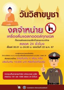 เมื่ิอวันที่ 21 พฤษภาคม 2567 พล.ต.ต.หญิง สมพร พูลเกษม ผู้บังคับการกองสารนิเทศ เปิดเผยว่า ด้วยวันที่ 22 พฤษภาคม 2567 เป็น “วันวิสาขบูชา” และมีประกาศสำนักนายกรัฐมนตรี เรื่อง กำหนดวันห้ามขายเครื่องดื่มแอลกอฮอล์ (ฉบับที่ 3) พ.ศ.2558 ห้ามมิให้ผู้ใดขายเครื่องดื่มแอลกอฮอล์ในวันมาฆบูชา วันวิสาขบูชา วันอาสาฬบูชา วันเข้าพรรษา และวันออกพรรษา ยกเว้นเฉพาะร้านค้าปลอดอากรภายในอาคารท่าอากาศยานนานาชาติ โดยมีกระทรวงสาธารณสุขเป็นหน่วยรับผิดชอบควบคุม กำกับ ดูแล ตามพระราชบัญญัติควบคุมเครื่องดื่มแอลกอฮอล์ พ.ศ.2551