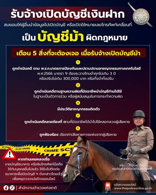 สำนักงานตำรวจแห่งชาติเตือน 5 สิ่งที่จะต้องเจอ เมื่อรับจ้างเปิดบัญชีม้า พล.ต.ต.ศิริวัฒน์ ดีพอ รองโฆษก
