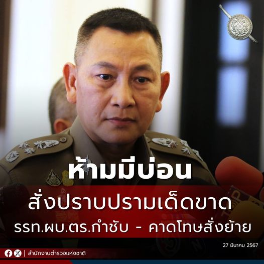 รรท.ผบ.ตร. สั่งลงดาบย้าย ผกก.สน.พญาไท หลังกองปราบฯ จับบ่อนพนันในพื้นที่ พร้อมกำชับเข้มทั่วประเทศ ห้ามมีบ่อน ปราบปรามเด็ดขาด คาดโทษย้ายจริง