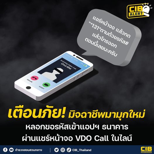 เตือนภัย! มิจฉาชีพมามุกใหม่ หลอกขอรหัสเข้าแอปฯ ธนาคาร ผ่านแชร์หน้าจอ VDO Call ในไลน์ . หากเราได้รับก