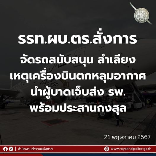 รรท.ผบ.ตร.สั่งการจัดรถสนับสนุนลำเลียงเหตุเครื่องบินตกหลุมอากาศ นำผู้บาดเจ็บส่ง รพ.พร้อมประสานกงสุล พ